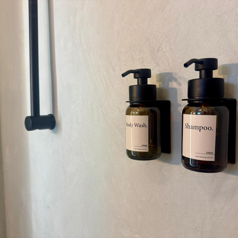 The combination of grey microcement and black fittings gives the room a clean and elegant look. A touch of color is added by the sage green vanity unit with a countertop basin, bringing a fresh note to the space.